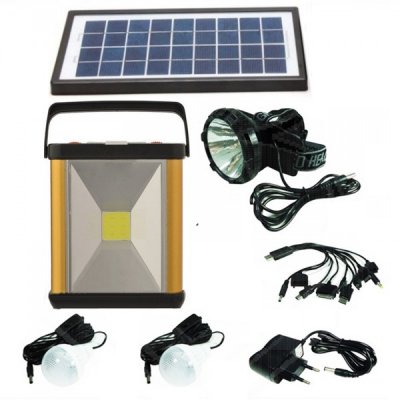 Kit Solar de Iluminat si Alimentare dispozitive la USB, cu Lanterna LED, lanterna Frontala, si2 Becuri cu LEDuri. Setul de incarcare solara include un acumulator Plumb-acid de 6V4Ah, cu incarcare de la Panoul Solar 6V 3.5W, sau de la 220V, model GD Lite GD-8032.