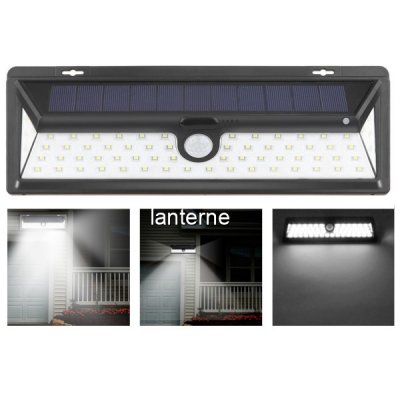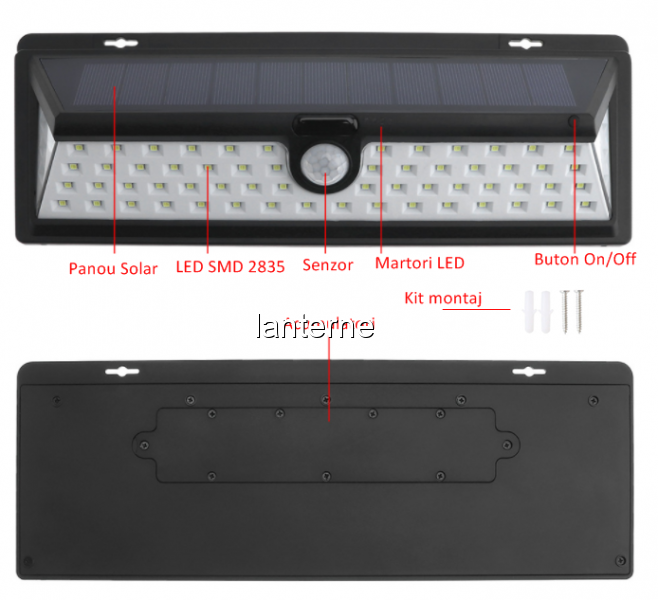 Lampa cu 66 Led-uri SMD 2835, model tip Ever Brite, dispune de incarcare solara si are incorporat un senzor de miscare si unul de lumina, de asemenea, dispune si de buton On/Off, de 3 faze de iluminare si de panou solar pentru a functiona fara sa mai fie nevoie de fire si intrerupatoare complicate.