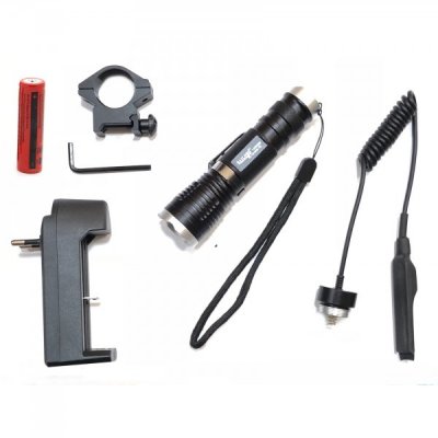 Lanterna de vanatoare pentru arma Bailong BLQ-1835-T6, cu LED 3W, Zoom, incarcator 220V, cu buton tactic pe fir si o singura faza de iluminare, cu lumina Alba-Rece.