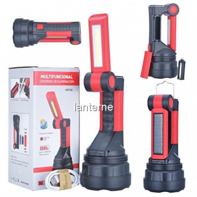 Lanterna cu incarcare Solara, dispune de Reflector principal, LED 10W si COB LED 5W pe partea interioara a manerului Mobil, Slot USB power bank, pentru alimentarea diverselor dispozitive mobile, Agatatoare metalica si Magneti in jurul reflectorului, Model W8106, ideala in expeditii, camping, ferme, balti, garaj, reparatii, pescuit, cautare, etc.